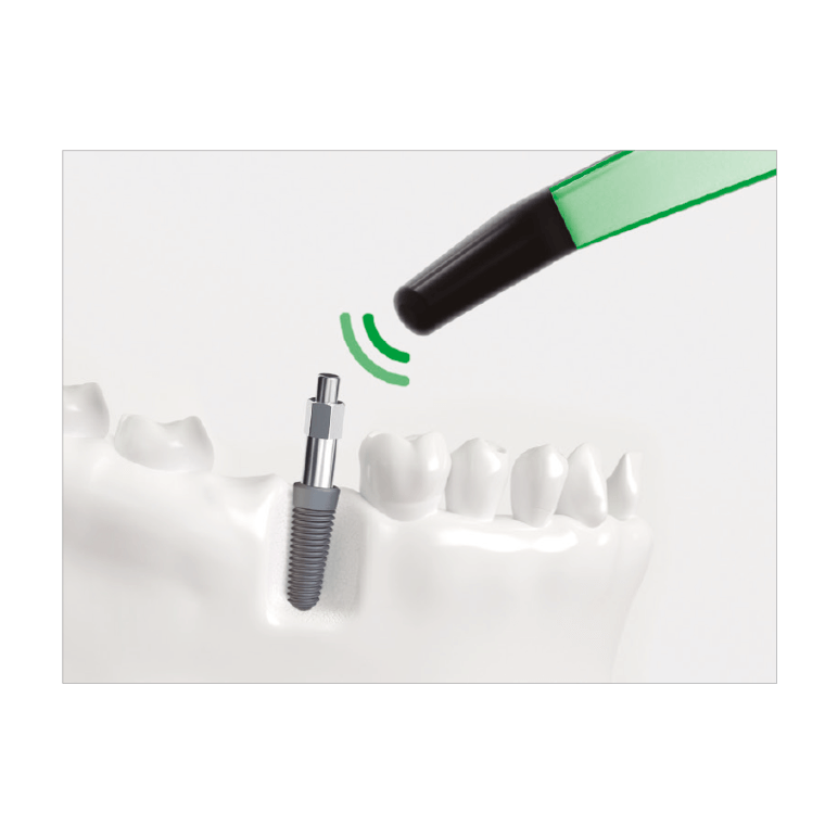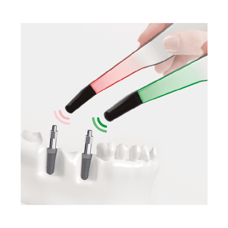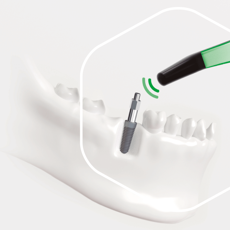 A sonda OSSTELL envia impulsos magnéticos a diferentes frequências (não utiliza percussão) para fazer vibrar o SmartPeg ligado ao implante, medindo a vibração para determinar a frequência da ressonância.