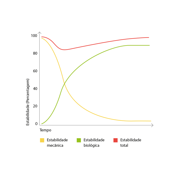 Como resultado da osseointegração, a estabilidade mecânica inicial é complementada e/ou substituída pela estabilidade biológica, sendo o valor final da estabilidade do implante a soma dos dois.