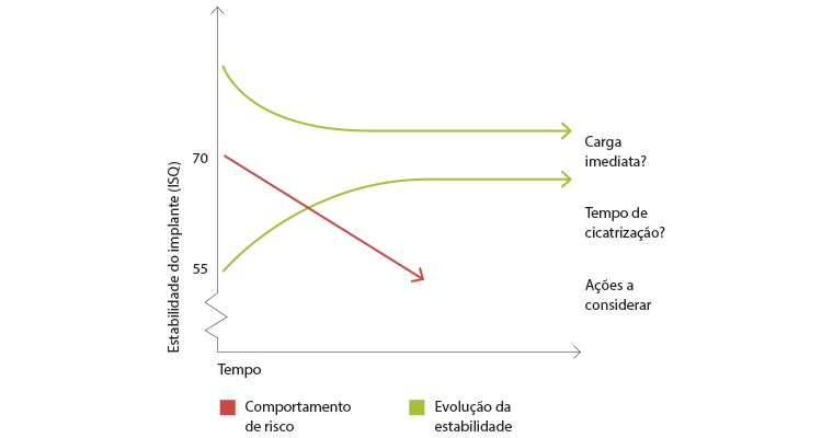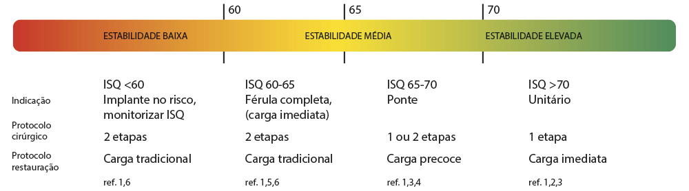 > Valores abaixo de 60 ISQ (cor vermelha), são indicadores de baixa estabilidade, portanto, o tratamento mais recomendável seria um tratamento conservador, com um protocolo cirúrgico de 2 etapas, com alguns meses de “cicatrização” para alcançar a osseointegração do implante e alguns valores ISQ que permitem que a carga seja feita com segurança.