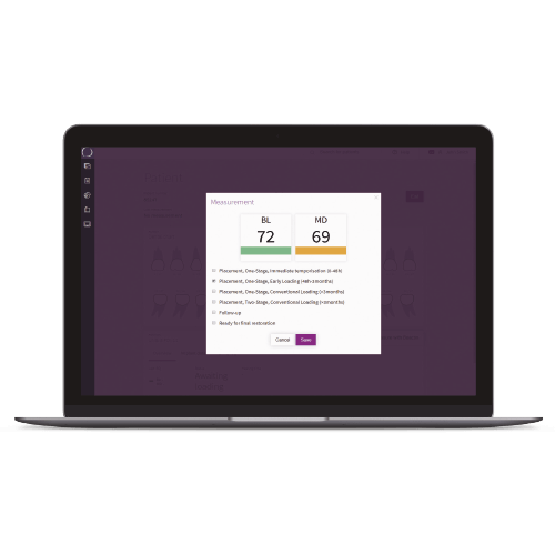 Ao realizar medições com a OSSTELL, é possível indicar, para melhor monitorização, o protocolo a ser realizado, se estão a ser realizadas medições de “acompanhamento” e, finalmente, se o implante está pronto para a carga final.