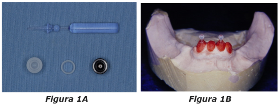 Figuras 1A e 1B: em 1A pode ser observado em azul o componente calcinável, ou seja, que serão fundidos em metal e posteriormente cimentados na conduto radicular. No sistema Implacil De Bortoli existem estas duas possibilidades – encaixes individuais do tipo O’ring ou bola (calcináveis e a serem cimentados no conduto) e também o sistema Barra Clip (cuja barra em plástica será posicionada entre os dentes ou implantes pilares para em seguida serem fundidas em metal). Em ambos os casos a cápsula do O’ring e o Clip ficarão capturados na base da prótese. Em 1B notamos o encaixe bola ou O’ring já preparados, reembasados com resina Duralay e prontos para serem incluídos e fundidos em metal.