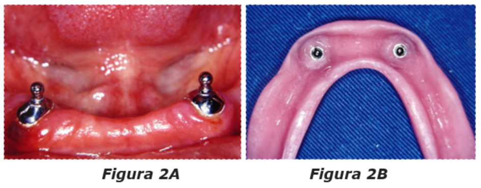 Figuras 2A e 2B: em 2A pode ser observado os encaixes do tipo bola ou O’ring já cimentados nos condutos radiculares e em 2B os nylons de retenção capturados na base da prótese.