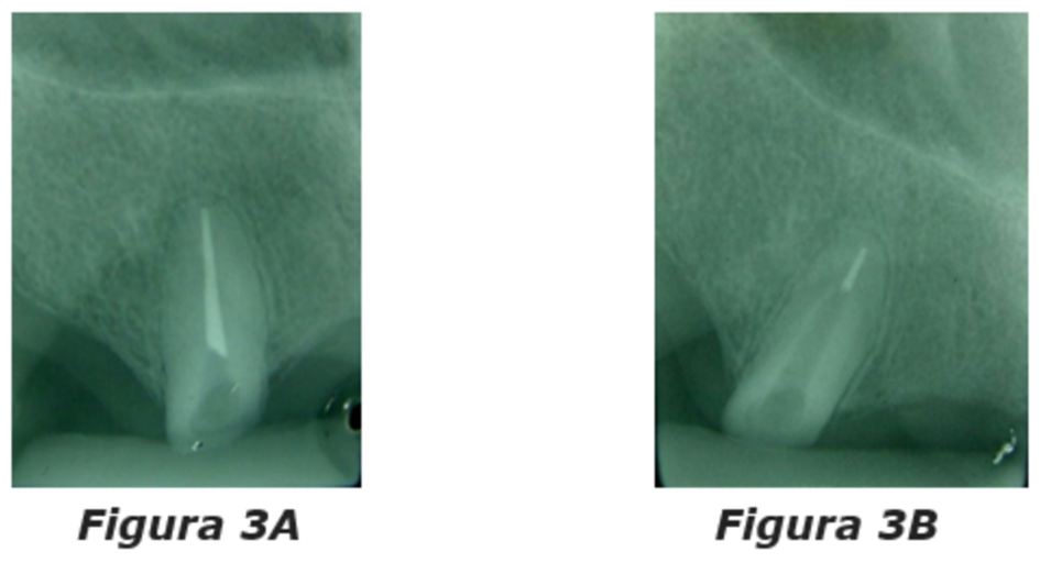 Figuras 3A e 3B: em 3A pode ser observado o estado adequado do tratamento endodôntico realizado, assim como a ausência de espessamento do ligamento periodontal. Em 3B notamos o conduto já desobturado como mandam as regras para a instalação dos retentores radiculares, ou seja, 2/3 de desobturação do conduto radicular.