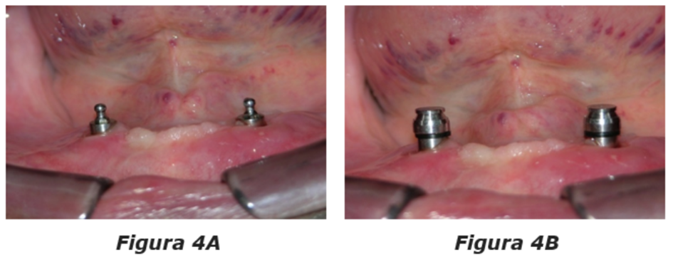 Figuras 4A e 4B: em 4A pode ser observado os encaixes do tipo bola instalados sobre os implantes e em 4B temos as cápsulas de retenção que ficarão alojadas na base protética, sendo que toda vez que o paciente inserir ou remover a prótese elas irão abotoar sobre os encaixes parafusados nos implantes.