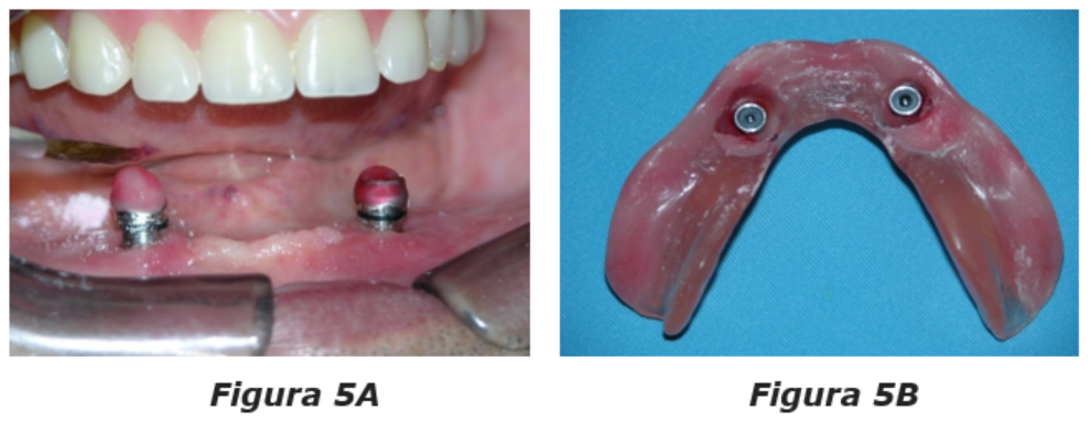 Figuras 5A e 5B: em 5A pode ser observado a colocação da resina Duralay para a captura das cápsulas na base da prótese e em 5B temos as cápsulas já capturadas na overdenture.