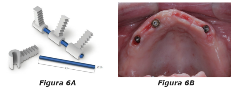Figuras 6A e 6B: em 6A pode ser observado a barra Implacil De Bortoli em sua forma natural – plástica com diâmetro e comprimento descritos na imagem e seus respectivos Clips de retenção que ficarão na base protética. Em 6B temos o aspecto clínico inflamado logo após a remoção de uma barra, talvez por falta de manutenção do paciente.