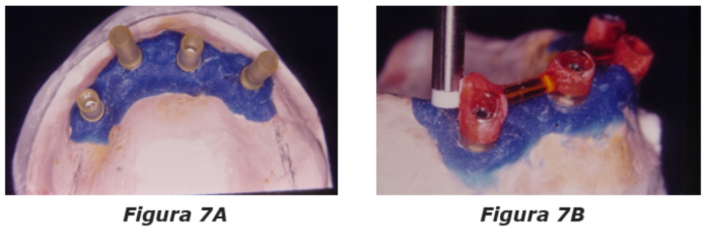 Figuras 7A e 7B: em 7A pode ser observado os cilindros calcináveis sobre os análogos dos implantes demonstrando ausência de paralelismo entre os implantes e falta de espaço para a colocação adequada de uma barra mais seu Clip de retenção. Em 7B temos um componente O’ring sendo posicionado com o auxílio de um delineador, o que irá favorecer e muito o eixo de inserção e remoção da overdenture.