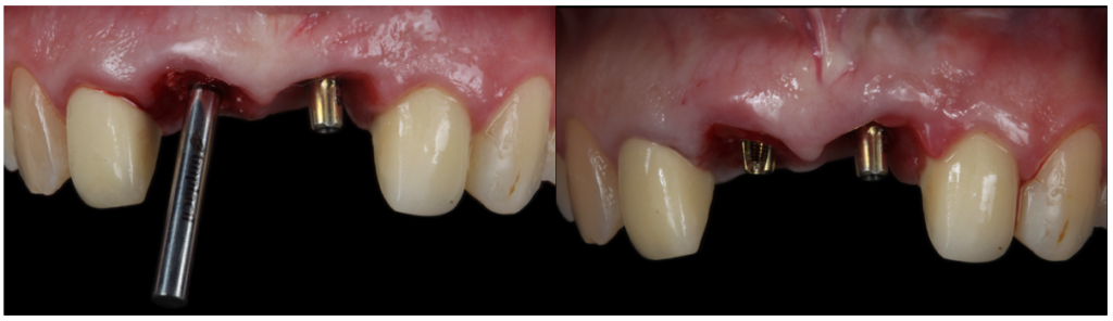 Paciente apresentou indicação de exodontia do elemento 11. Optou-se pela instalação imediata de implante em alvéolo fresco, com preenchimento do GAP vestibular por biomaterial xenógeno Extra Graft, com o objetivo de preservar volume ósseo e minimizar reabsorção da tábua vestibular. A manutenção da arquitetura alveolar após implante imediato está amplamente descrita na literatura como estratégia eficaz para redução de colapso tecidual em região estética estética² (Figura 1).