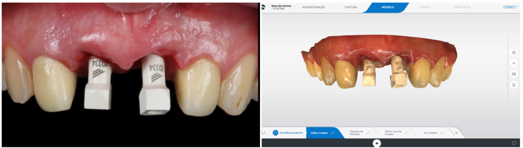 Foram instalados scan bodies para escaneamento intraoral e obtenção de modelo digital, possibilitando planejamento CAD/CAM dos provisórios. O fluxo digital permitiu controle preciso da morfologia cervical, respeitando os limites biológicos e reproduzindo contornos progressivos na região subcrítica (Figura 4).