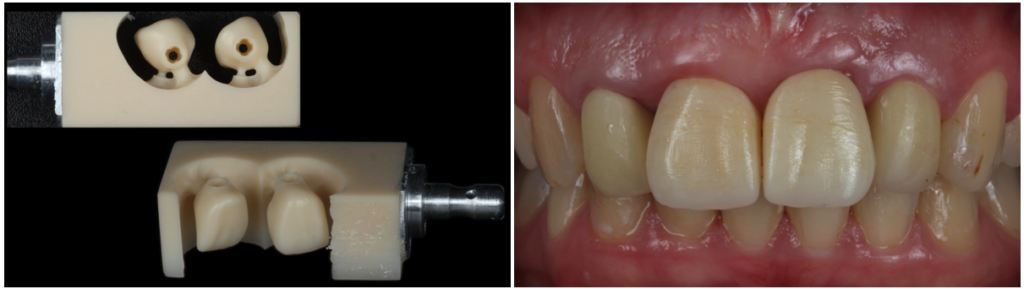 Os provisórios foram confeccionados em PMMA fresado industrialmente por sistema CAD/CAM. O PMMA industrial apresenta maior homogeneidade estrutural, menor porosidade e melhores propriedades mecânicas quando comparado aos materiais autopolimerizáveis convencionais⁶. Tais características favorecem estabilidade temporária, precisão marginal e melhor resposta tecidual (Figura 5).