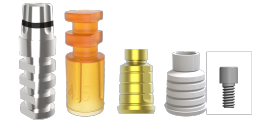 Este pilar é de fácil instalação e de fácil moldagem. A família do Pilar Ideale é composta por um análogo, um transferente de moldagem, um coping de provisório, um coping de fundição e um parafuso de fixação quando utilizamos o fluxo analógico. Isto é, quando executamos a moldagem convencional (Figura 5).