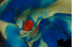 A moldagem foi realizada com silicone de condensação e após a polimerização do material, o molde foi retirado, arrastando consigo o transferente de moldagem (Figura 18).