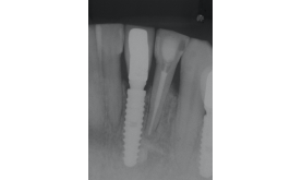 Na consulta seguinte, a coroa metalocerâmica foi instalada no elemento 41 e o orifício de acesso do parafuso foi restaurado com resina composta. Foi também realizada uma radiografia para posterior controle (Figuras 22, 23 e 24).