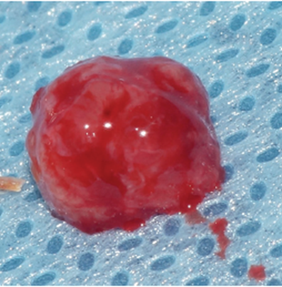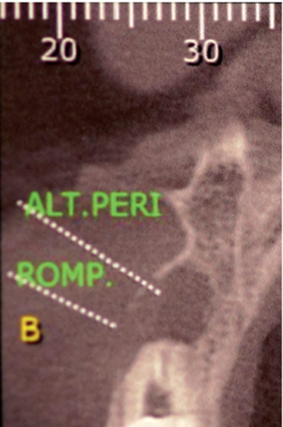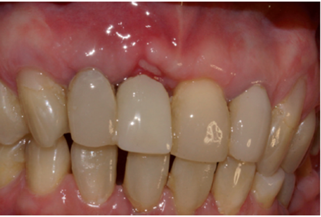 Paciente A.N., sexo feminino, 54 anos, procurou a clínica odontológica com fistula na região do elemento 11 (Figura 1). Foi solicitada tomografia computadorizada Cone Beam da região (Figura 2). Ao exame tomográfico foi diagnosticada a lesão periapical extensa, com perda óssea, envolvendo o elemento 11 (Figura 3). O plano de tratamento proposto foi a exodontia do elemento 11, curetagem da lesão e instalação imediata de um implante Cone Morse, juntamente com o procedimento de ROG, fazendo uso de biomaterial de origem bovina (Bio-Oss 0,25) e membrana de PTFE-d (Cytoplast TXT–200, Osteogenics – Lubbock TX, EUA) no mesmo momento cirúrgico.