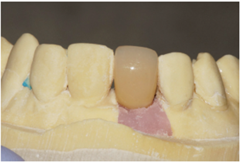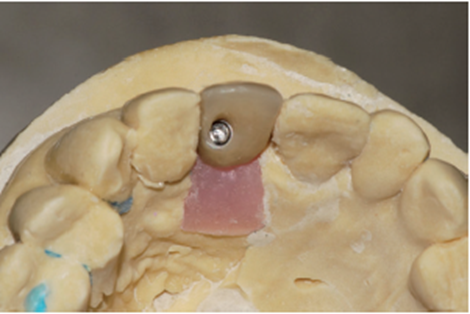 No laboratório, o técnico de prótese posicionou o pilar Ideale angulado no modelo (Figura 27) e confeccionou um incisivo central parafusado sobre ele, utilizando a coifa de provisório que o sistema oferece (Figura 28). Uma vez obtido o provisório, o cicatrizador voltou a ser removido e o pilar Ideale e o provisório foram instalados em boca (Figuras 30 e 31). O pilar foi torqueado em 20 Ncm e o parafuso da coroa foi torqueado em 10 Ncm. Após 15 dias, o provisório foi removido e observou-se o perfeito perfil de emergência que havia sido obtido (Figura 33). Neste novo momento foi posicionado sobre o pilar um transferente plástico de moldeira fechada do pilar Ideale, sendo que tanto o pilar como o dente 12 foram moldados (Figura 34) para a confecção de copings e posterior a aplicação da cerâmica (Figura 35).