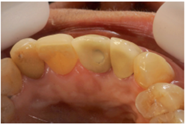 Após a conclusão desses passos pelo laboratório, a prótese do elemento 12 foi cimentada com fosfato de zinco e a prótese sobre o pilar Ideale foi parafusada e torqueada a 10 Ncm (Figura 36). O orifício de acesso foi restaurado com resina fotopolimerizável (Figura 37). Uma radiografia final foi realizada, demonstrando o perfeito assentamento da coroa sobre o pilar Ideale.