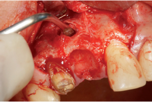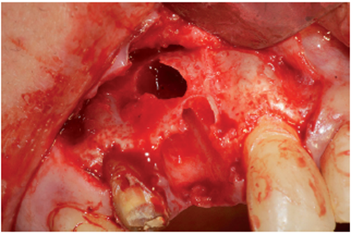 O procedimento cirúrgico foi iniciado através de uma anestesia infiltrativa com articaína 4%. Foram realizadas incisões relaxantes (Figura 4) para expor o leito cirúrgico e, consequentemente, a lesão periapical (Figura 5). Após o deslocamento do retalho, foi realizada a exodontia de forma atraumática (Figura 6) e na sequência, foi feita a curetagem do alvéolo removendo todo o tecido de granulação (Figura 7). Uma vez realizada a toalete do leito cirúrgico (Figuras 8 e 9), o implante Cone Morse Due Cone de 3.5 X 13 mm (Implacil De Bortoli) foi instalado seguindo o melhor posicionamento dentro do rebordo residual, conforme planejado (Figuras 10 e 11). Em sequência, foi realizada a instalação do Cover Screw (Figura 12) e o preenchimento do defeito ósseo com biomaterial (Bio-Oss 0,25), conforme figuras 13 e 14). O fechamento foi realizado com membrana de PTFE-d (Cytoplast TXT–200, Osteogenics – Lubbock TX, EUA), customizada para ser adaptada sobre o defeito ósseo, estendendo-se de 3 a 5 mm da margem do defeito ósseo e intencionalmente exposta (Figura 15). A sutura foi realizada com fio de PTFE (Cytoplast), como podemos observar na figura 16, e instalado um provisório adesivo na região (Figura 17).