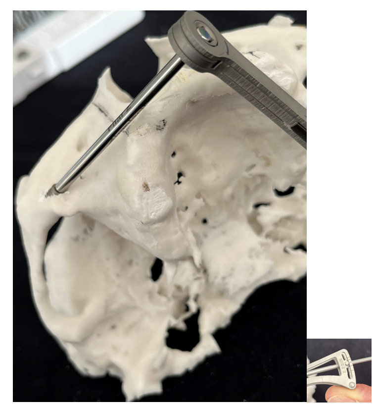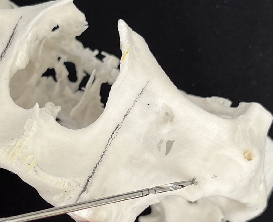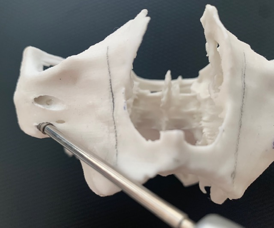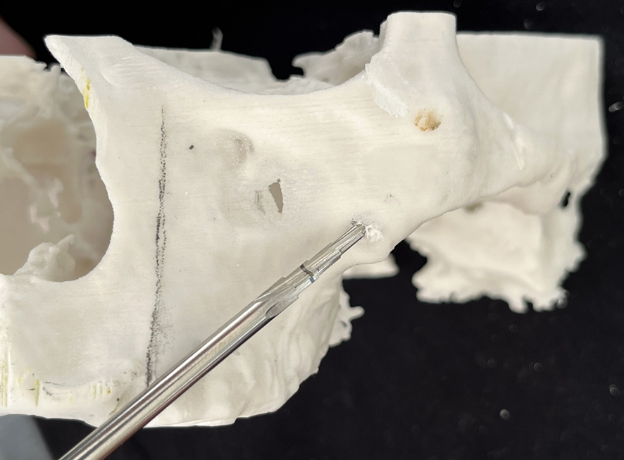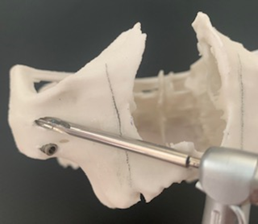 6- Análise da espinha nasal. Dependendo da sua anatomia, haverá necessidade de osteotomia para corrigir a angulação de entrada no zigoma. Requer do cirurgião-dentista habilidade para a correção da fresagem e para evitar a trepanação;