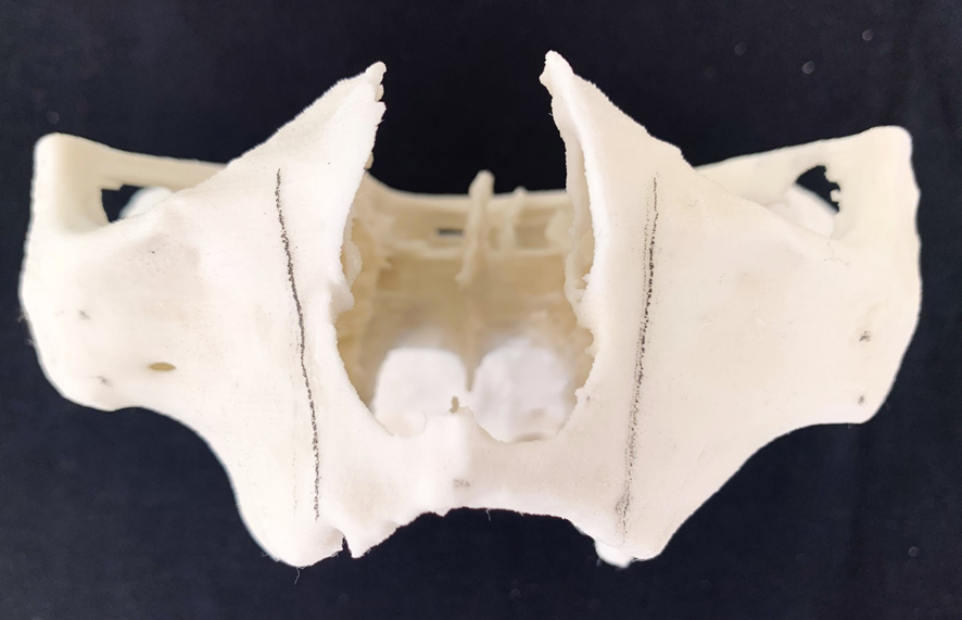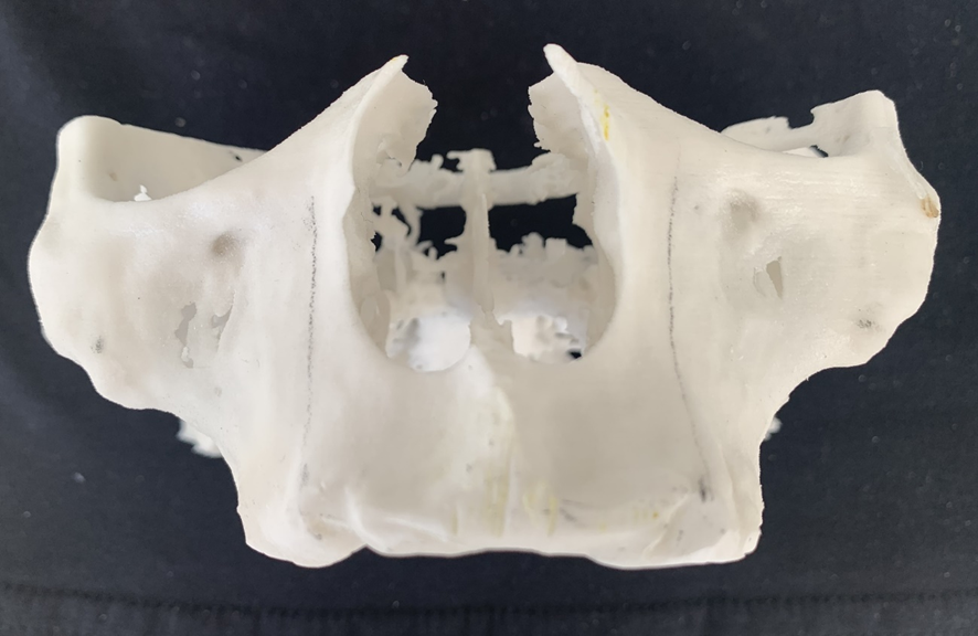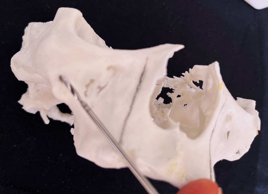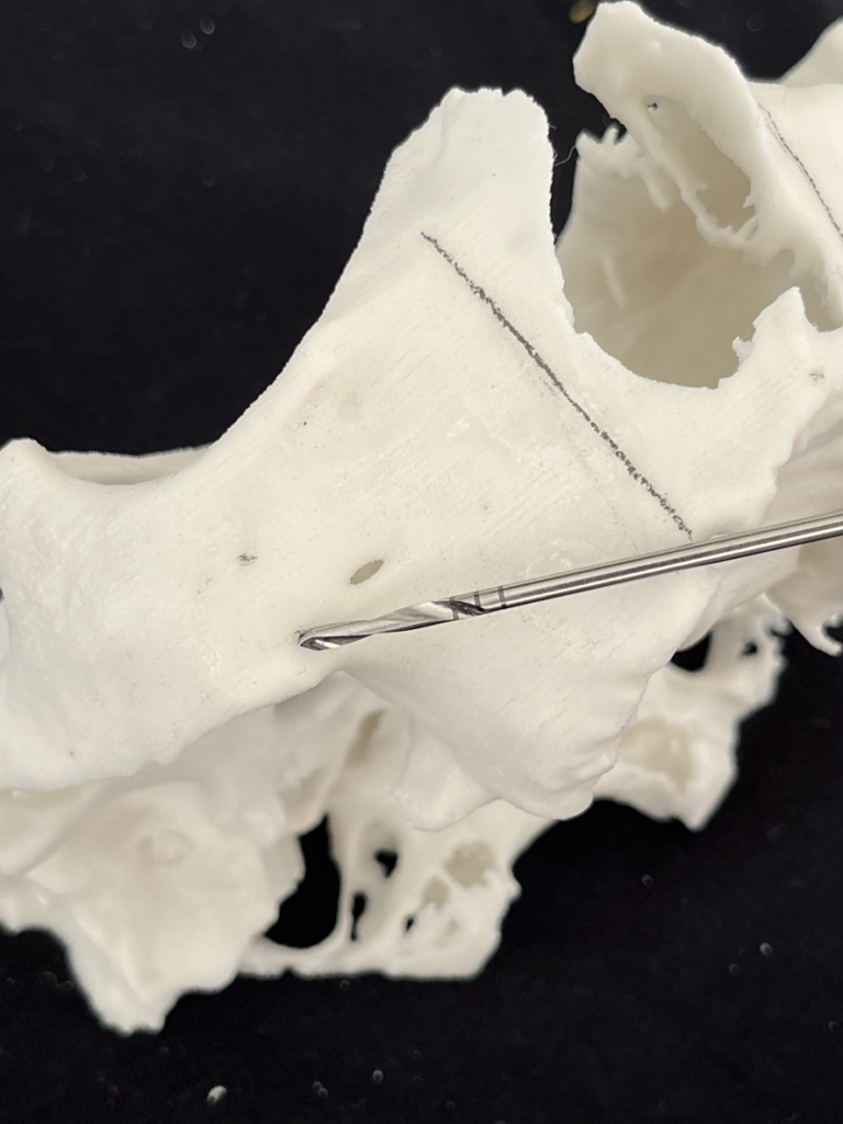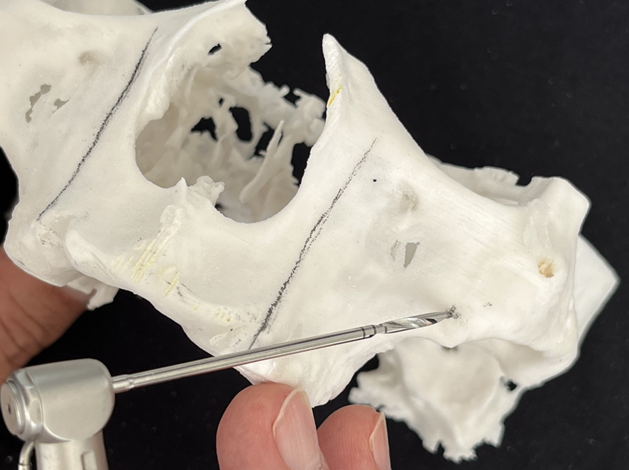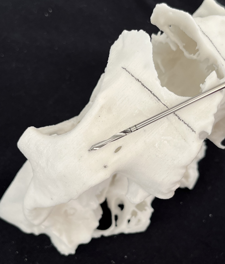 6- Análise da espinha nasal. Dependendo da sua anatomia, haverá necessidade de osteotomia para corrigir a angulação de entrada no zigoma. Requer do cirurgião-dentista habilidade para a correção da fresagem e para evitar a trepanação;