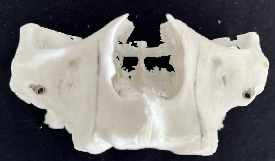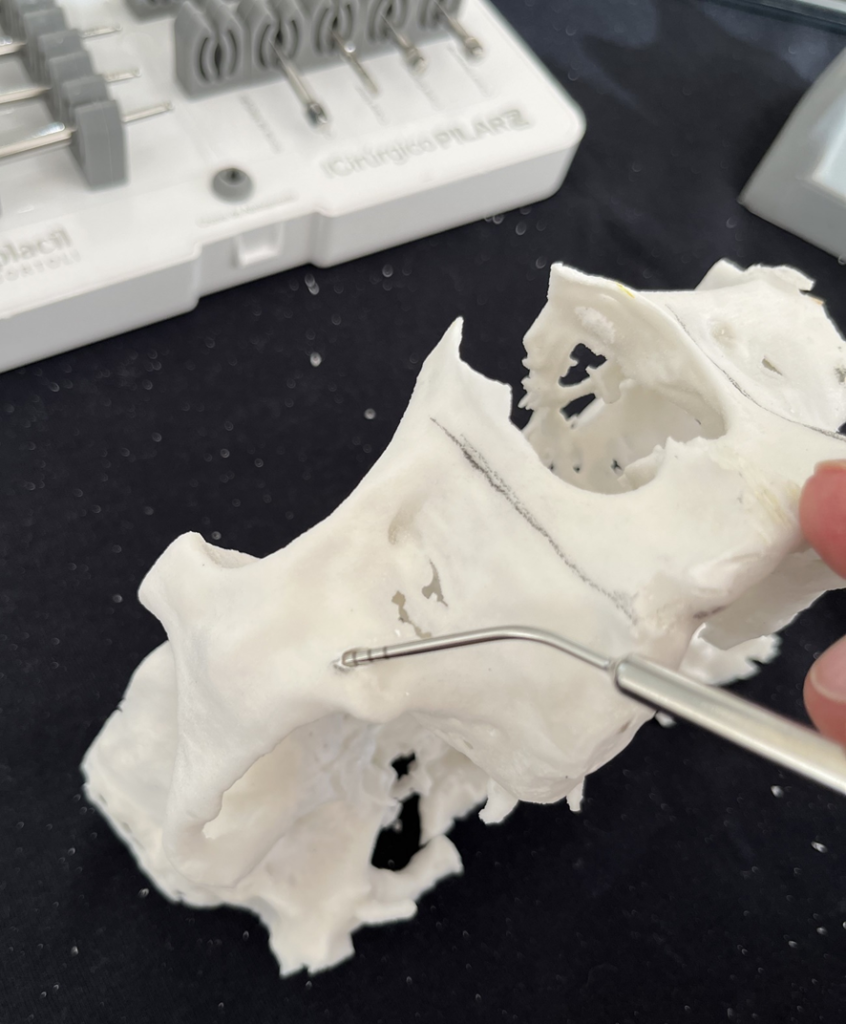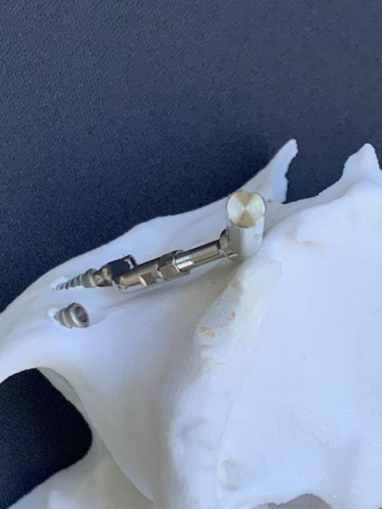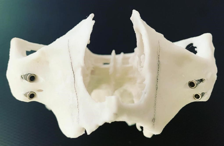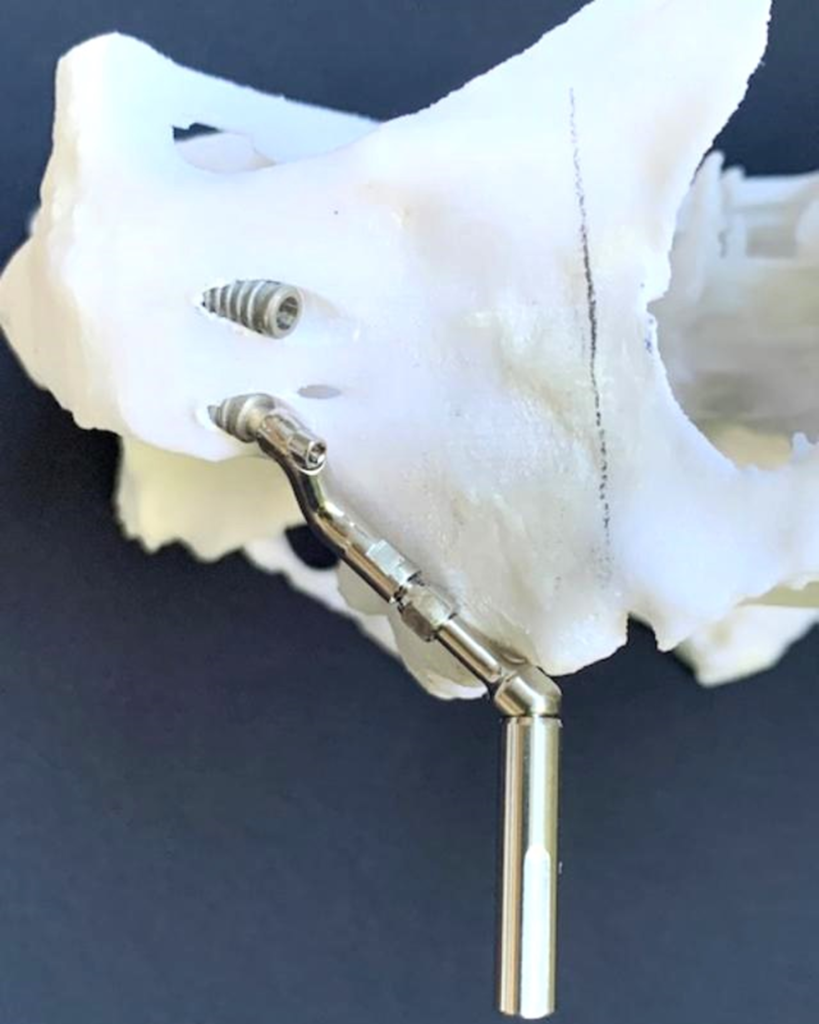 7- Simulação da instalação dos Pilares Z em biomodelo. Facilita a instalação durante o procedimento cirúrgico, altura, inclinação, local de osteotomia; quando necessário, posição da plataforma do implante, acomodação do implante no nicho da osteotomia