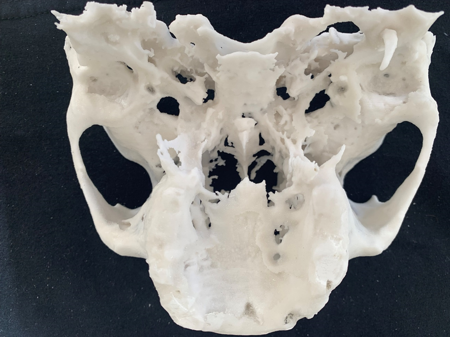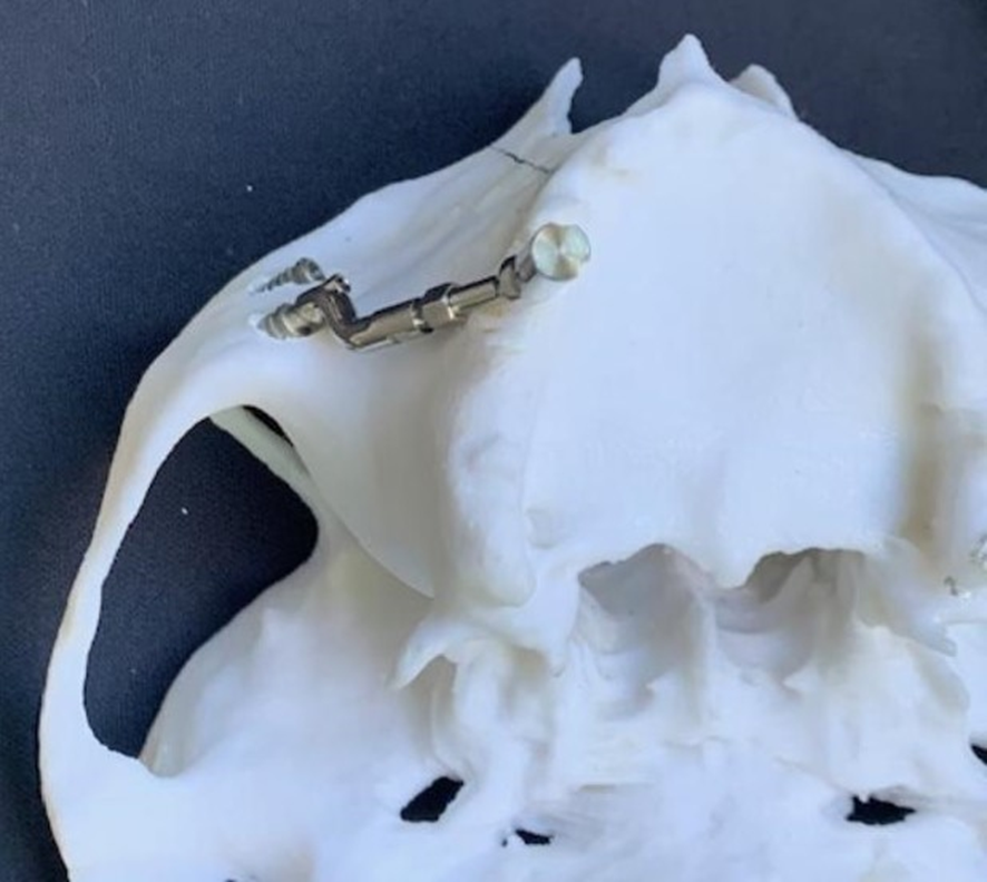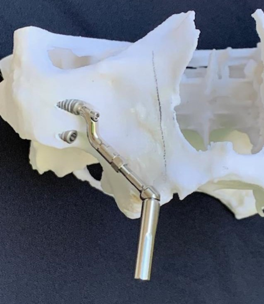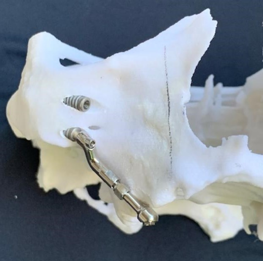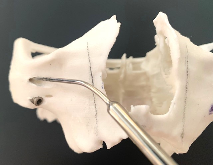 7- Simulação da instalação dos Pilares Z em biomodelo. Facilita a instalação durante o procedimento cirúrgico, altura, inclinação, local de osteotomia; quando necessário, posição da plataforma do implante, acomodação do implante no nicho da osteotomia
