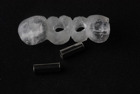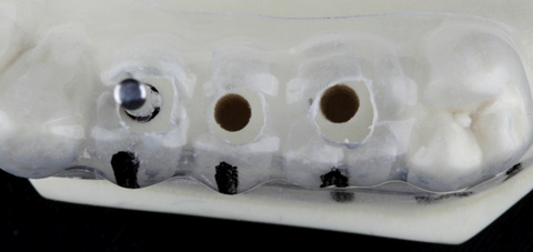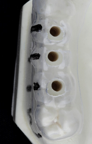 Após provar e ajustar a guia cirúrgica em boca, devemos realizar uma radiografia para assegurar a posição correta dos tubos metálicos em relação aos dentes adjacentes e, se houver necessidade, alterar a posição dos tubos para melhor posicionamento dos implantes, respeitando sempre a posição 3D no sentido mésio-distal, vestíbulo-lingual e ápico-coronal. Em seguida, devemos limpar o guia com água e sabão e esterilizar, caso seja possível, previamente à cirurgia.