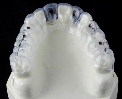 Outra excelente alternativa é o uso de placas de acetato que serão usadas para a duplicação do enceramento obtido e em seguida servir de guia para a instalação dos implantes, conforme imagens abaixo.