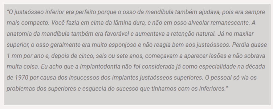 Niltão recorda que o Dr. Sérgio Jayme mostra sempre um caso de justaósseo inferior feito pelo Niltão na década de 1970. Ele trocou a prótese apenas porque estava muito desgastada, mas os implantes estavam lá, bem firmes, e o justaósseo estava perfeito. O Dr. Sérgio Jayme continua dando manutenção neste caso, que agora já está com mais de 40 anos de acompanhamento.
