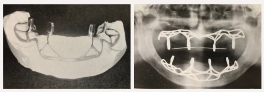 Para entendermos a resposta muito interessante que o Niltão me deu, vale a pena relembrarmos como funcionavam estes implantes. Na verdade, os implantes subperiósteos, também chamados de justaósseos, eram implantes de superfície. Ou seja, não penetravam na intimidade do tecido ósseo, mantendo uma relação de contato com o osso por justaposição. Preliminarmente, eles foram desenvolvidos pelo sueco Gustav Dahl, em 1943, e contavam com uma estrutura metálica de cromo-cobalto-molibdênio que era fabricada sobre um modelo de gesso previamente obtido do osso exposto do paciente durante a cirurgia. As Figuras 1 e 2 ilustram este tipo de implante.