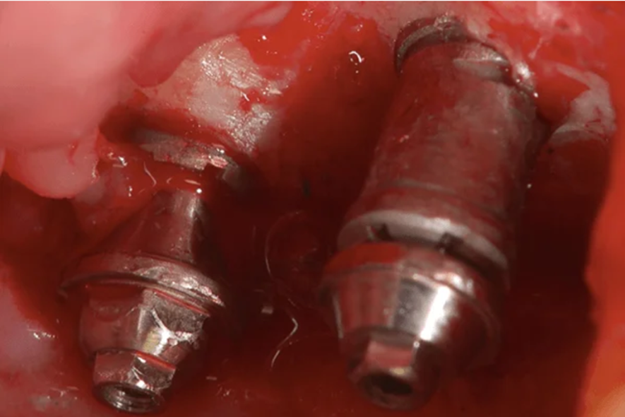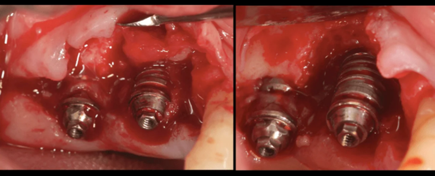 Figura 2 – Retalho descolado com a exposição das espiras que sofreram perda óssea no implante 16.