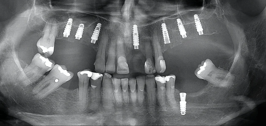 Figura 6 – Radiografia panorâmica feita após cinco anos da instalação de oito implantes tipo Cone Morse de 3,5 mm de diâmetro (Cone Morse Due Cone – Implacil De Bortoli – São Paulo, Brasil). Observar a presença de pilares mais estreitos e longos, o que favoreceu a manutenção das cristas ósseas em um nível coronal aos implantes, sem peri-implantite.