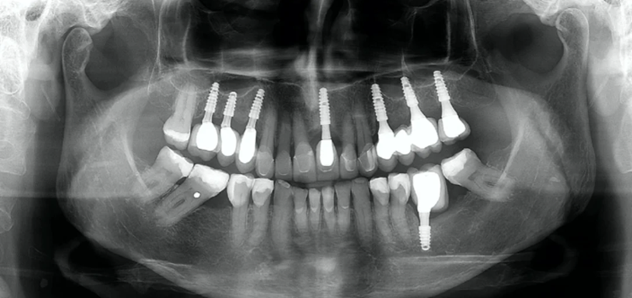Figura 5 – Radiografia panorâmica feita imediatamente após a instalação de oito implantes tipo Cone Morse de 3,5 mm de diâmetro (Cone Morse Due Cone – Implacil De Bortoli – São Paulo, Brasil).
