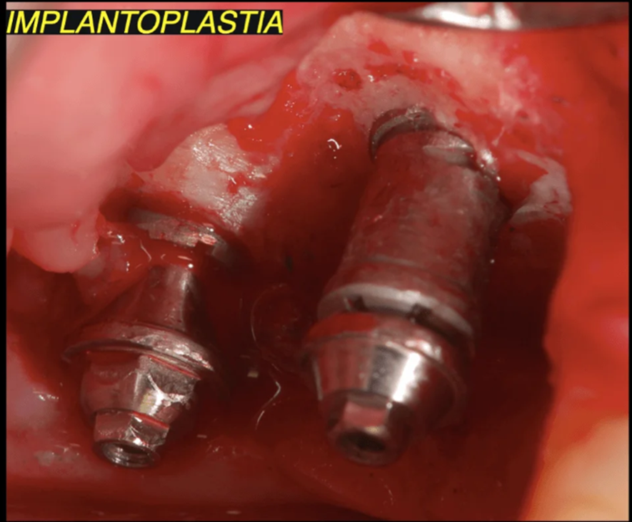 Este caso foi solucionado através da realização de uma implantoplastia (remoção e alisamento, com brocas de alta rotação e borrachas de polimento, das espiras contaminadas e que sofreram perdas ósseas). Após dois anos de controle, observou-se que a perda óssea cessou e a saúde peri-implantar foi reestabelecida. As figuras 2 a 4 ilustram a técnica de implantoplastia.