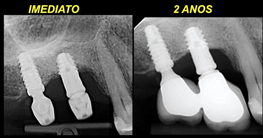 Figura 4 – Radiografias periapicais do pós-imediato da implantoplastia e do controle de dois anos. Observar a estabilidade óssea ao redor dos implantes.