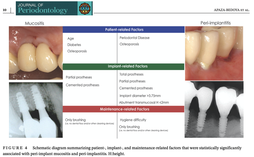 Quando dizemos que existe uma associação da doença peri-implantar com estes fatores, significa dizer que pacientes com osteoporose e periodontite prévia têm mais chances de desenvolver a peri-implantite. Da mesma forma, implantes com diâmetros maiores do que 3,75, com altura de cinta menor do que 1,5mm, próteses fixas parciais e totais e pacientes com dificuldade de higiene também tem uma maior probabilidade de ter a doença. A figura 2 ilustra algumas das conclusões que estão no artigo.
