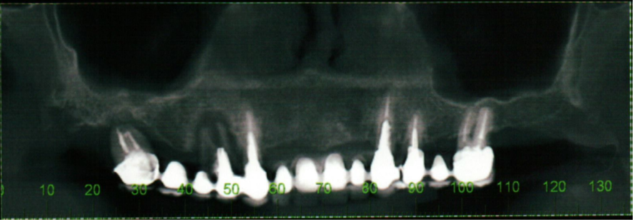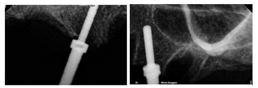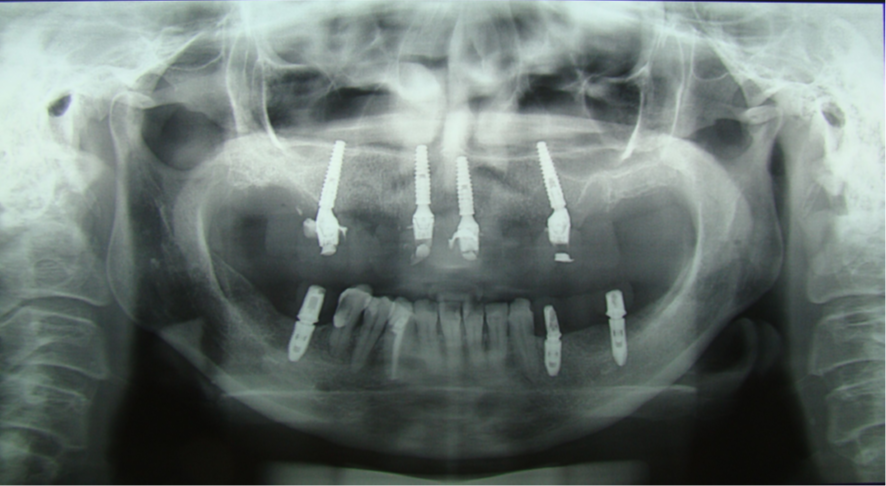 Foram planejados quatro implantes com distribuição biomecânica, segundo o polígono de Roy, de acordo com as radiografias transoperatórias abaixo.