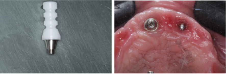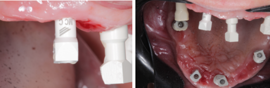 Instalados pilares Mini Cônicos Implacil De Bortoli e coifas de titânio, sendo os gaps alveolares preenchidos com Extra Graft.