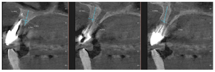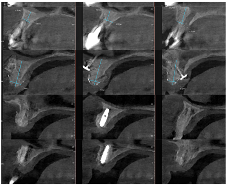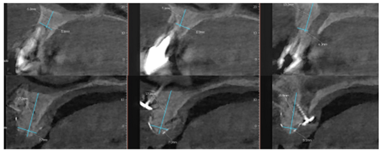 Após oito meses, foi realizada nova tomografia para análise do ganho ósseo vertical, assim como o planejamento dos implantes do tipo Cone Morse Maestro – Implacil De Bortoli (Figura 7). Foram planejados e realizados dois implantes 3.5 X 11 mm Cone Morse Maestro após remoção da membrana Cytoplast, devido ao ótimo ganho ósseo vertical, evidenciando sucesso da técnica de regeneração óssea guiada (Figuras 8, 9 e 10). Após a espera de apenas três meses devido a qualidade do implante e suas câmaras de cicatrização, o que possibilita uma osseointegração precoce, foram realizadas duas metalocerâmicas parafusadas sobre pilares Ideale reto, da Implacil De Bortoli, devido ao ótimo posicionamento tridimensional (Figuras 11 e 12).