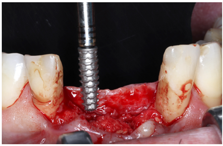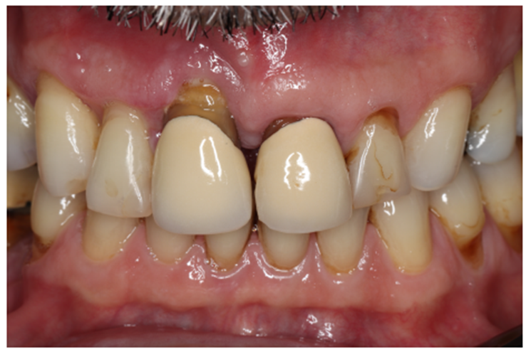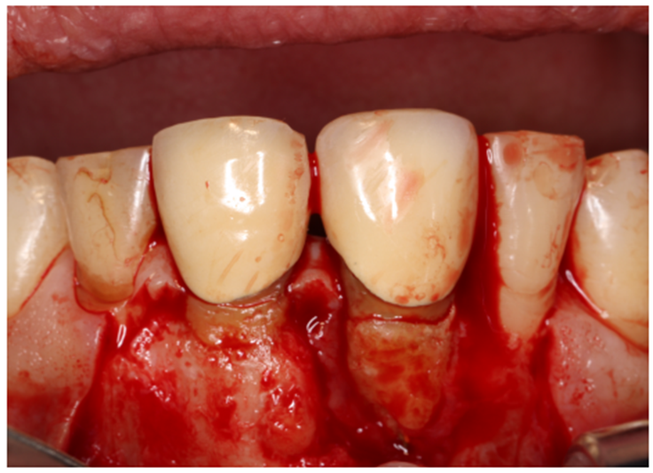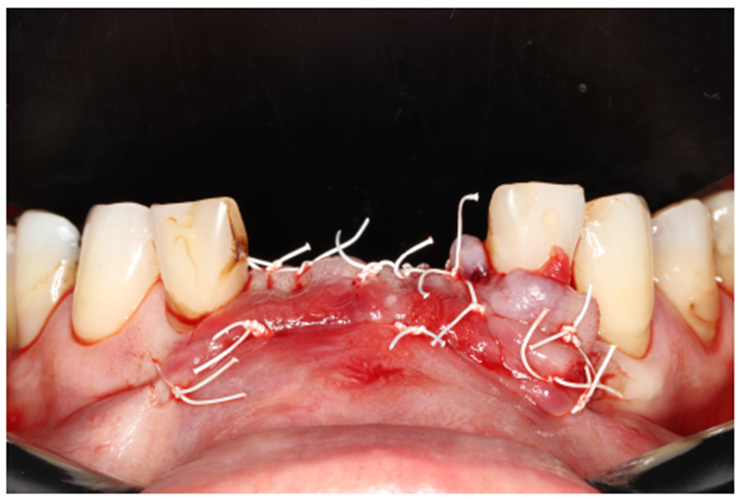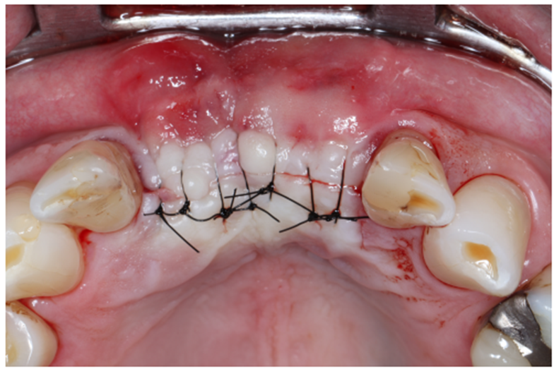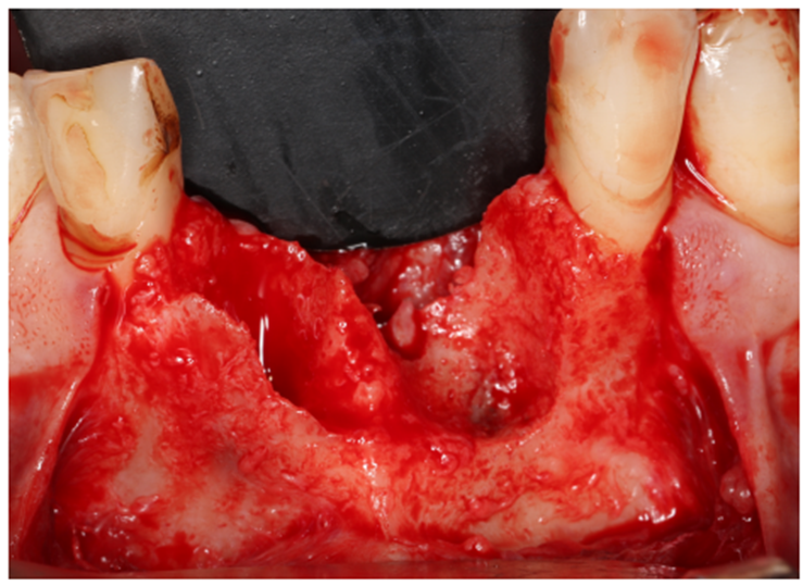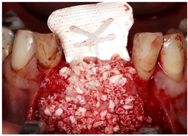 Paciente RV, do sexo masculino de 52 anos, compareceu a nossa clínica com queixa estética e funcional dos dentes incisivos centrais superiores. No exame clínico observou-se doença periodontal severa com presença de bolsa periodontal e perda óssea marginal maior do que 7 mm (Figura 1). Foi realizado em nossa escola (Beo – Ensino Odontológico Avançado) uma tomografia computadorizada para melhor planejamento cirúrgico do caso, onde confirmamos a necessidade de regeneração óssea guiada com membrana Cytoplast com reforço de titânio, devido à perda óssea vertical maior do que 7 mm (Figura 2). Após definição do planejamento cirúrgico, foi realizado a exodontia dos incisivos centrais superiores, limpeza cirúrgica da região e osteotomia periférica para melhor preparo do leito receptor do material de enxertia de lenta reabsorção Bio-Oss (Geistlich) e da membrana Cytoplast com reforço de titânio 30 mm X 40 mm (Figuras 3,4 e 5). Após estabilização da membrana, foi realizado a sutura com fio do tipo Cytoplast 3.0 mm devido a sua alta plasticidade, diminuindo o risco de deiscência de sutura (Figura 6).