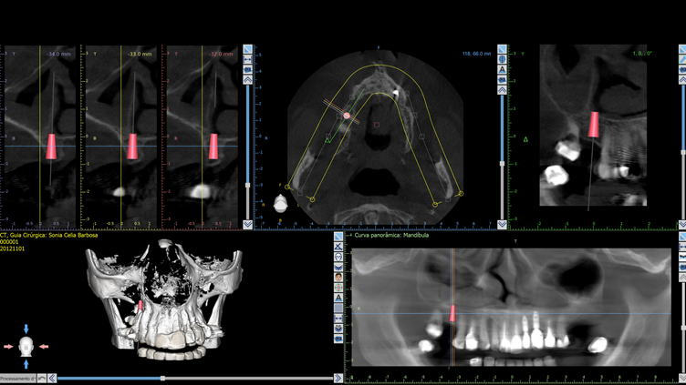 No planejamento protético, definiu-se o uso de um pilar Ideale 4,5 × 4 mm, rotacionalmente livre, que permite instalação em qualquer posição e pode receber coroas cimentadas ou parafusadas. A escolha visava otimizar a resposta tecidual e oferecer flexibilidade restauradora. Optou-se por coroa unitária parafusada diretamente ao pilar, confeccionada em zircônia monolítica pela sua durabilidade e estética. O fluxo seria totalmente digital: após a osseointegração, o pilar seria escaneado com scan body específico e a coroa desenhada virtualmente para fresagem em zircônia de alta resistência.