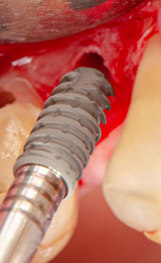 O implante Maestro Superiore representa uma evolução do modelo Maestro convencional, mantendo e aprimorando características macro e microgeométricas fundamentais. O Maestro original já incorporava câmaras de cicatrização – pequenos espaços entre as espiras do parafuso que reduzem a compressão do tecido ósseo durante a instalação e servem como nichos para estabilização de coágulos sanguíneos, favorecendo a vascularização local e uma osteogênese mais acelerada (CIRANO et al., 2024). Evidências pré-clínicas mostram que os espaços entre as espiras do implante são rapidamente preenchidos por osso novo. Logo após a instalação, forma-se inicialmente um osso mais imaturo, que se deposita diretamente sobre a superfície do implante e na parede óssea ao redor. Com o tempo, esse osso inicial é remodelado em osso mais organizado e resistente, fortalecendo a estabilidade do implante dentro das câmaras de cicatrização. Esse mecanismo diminui a necrose de compressão e a reabsorção óssea ao redor do implante, aumentando a quantidade e qualidade do contato osso-implante de forma precoce. O Maestro Superiore preserva essas câmaras de cicatrização interespirais benéficas e as aprimora por meio de um novo processo de jateamento de superfície e de uma microgeometria otimizada. A superfície tratada apresenta microrrugosidades controladas (topografia microtexturizada) que favorecem a adesão celular e a atividade osteoblástica inicial, elevando o potencial de osseointegração do implante. Sabe-se que implantes com superfícies microtexturizadas (por exemplo, jateadas e atacadas ao ácido) promovem maior adsorção de proteínas do plasma e facilitam a fixação de osteoblastos na superfície titanizada, resultando em melhor formação óssea e maior percentual de contato osso-implante em comparação às superfícies usinadas lisas (GITTENS, R. A. et al.2014).