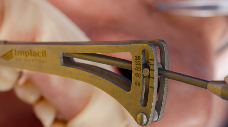 A paciente, de 57 anos, apresentava ausência do dente 16 e queixa mastigatória. A qualidade óssea foi estimada como tipo III (osso trabecular moderadamente denso) e, diante do biotipo periodontal favorável (gengiva espessa), optou-se pelo implante Cone Morse Maestro Superiore 4,0 × 0,9 mm. Sua macrogeometria favorece a formação óssea inicial e otimiza a estabilidade mesmo em osso de densidade moderada, permitindo alto torque de inserção sem compactação excessiva graças às câmaras de cicatrização que aliviam a pressão interna.