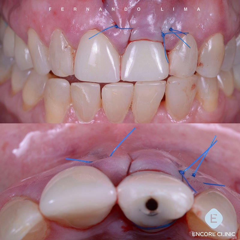 Para evitar possíveis perdas teciduais, foi realizado enxerto de biomaterial xenógeno com partículas pequenas no gap do alvéolo gerado pela distância da superfície externa da parede do implante e a face interna da parede óssea vestibular, assim como enxerto subepitelial de tecido conjuntivo estabilizado por suturas double-cross e simples.