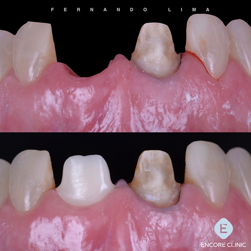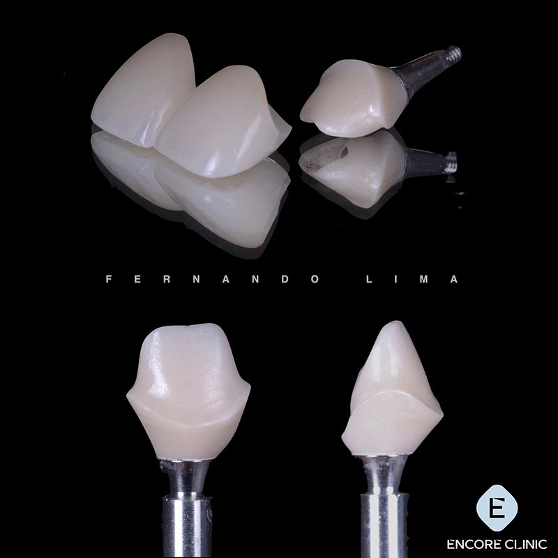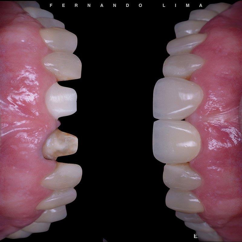 A reabilitação final foi conduzida com infraestrutura de zircônia sobre Pilar Base T 3.5×2.5 mm e confecção de duas coroas em dissilicato de lítio nos elementos 11 e 21.