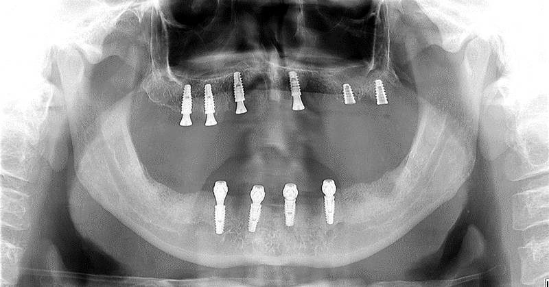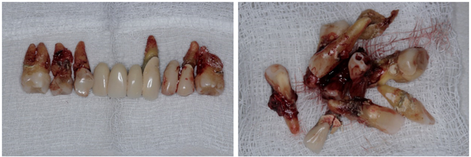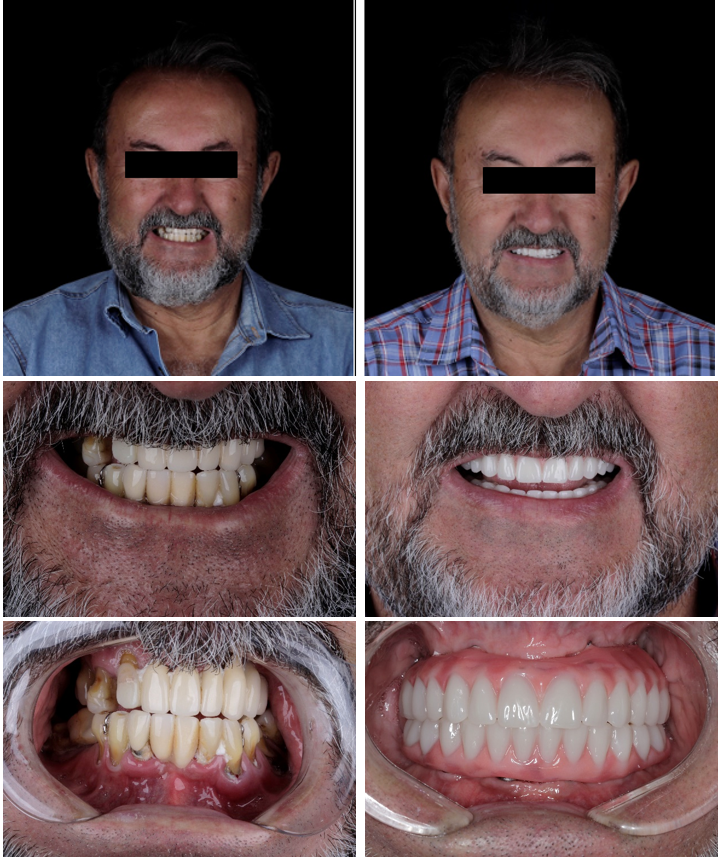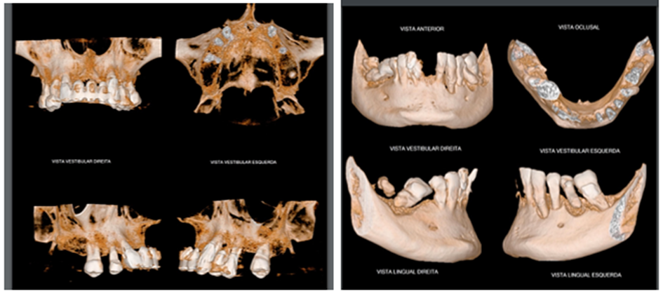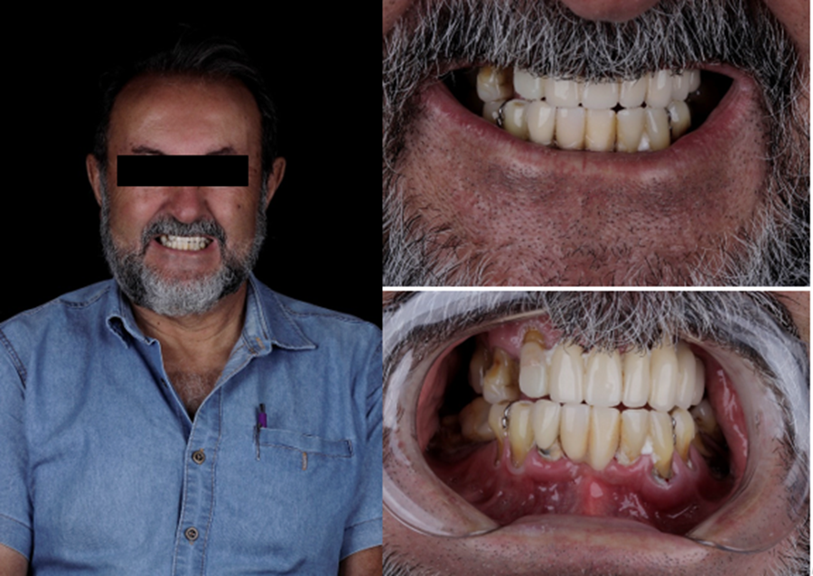 Diante dos exames foi proposto ao paciente a extração de todos os dentes remanescentes, instalação de implantes na maxila e mandíbula e duas próteses totais provisórias durante o período de osseointegração.