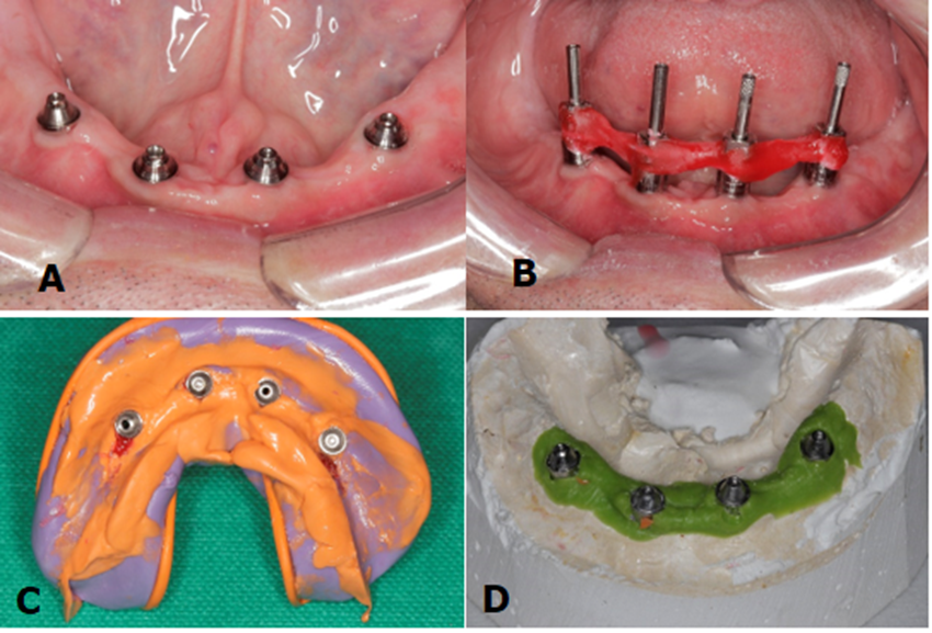 1- seleção dos pilares intermediários (mini-cônicos), instalação e moldagem de transferência. Obtenção dos modelos de trabalho e confecção de base de prova e planos de cera com o uso de dois componentes (cilindros de metal para provisório do pilares mini-cônicos);