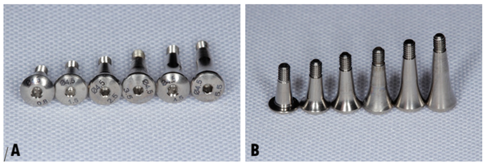 Figura 5 – Em A e B temos as vistas do cicatrizador pré-fabricado de 4.5mm de diâmetro com suas respectivas alturas de cintas metálicas (0.8/1.5/2.5/3.5/4.5/5.5) a serem escolhidas de acordo com a altura do tecido gengival existente.
