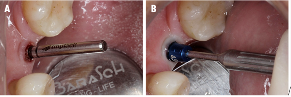 Figura 7 – Em A, temos o túnel check em posição; em B, temos o kit de seleção protética em ação para garantir uma seleção assertiva do componente protético.