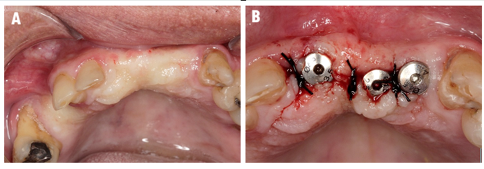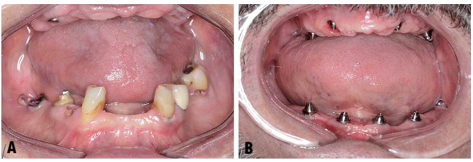 Figura 10 – Em A, temos um caso de múltiplas extrações; em B, temos os pilares instalados e prontos para receber a prótese protocolo.