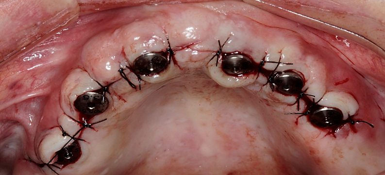 Outra situação que ainda irá requerer o uso dos cicatrizadores pré-fabricados e a reentrada cirúrgica está relacionada com casos complexos de múltiplas exodontias e pela praticidade de manuseio, onde os cicatrizadores pré-fabricados estarão mais bem indicados do que os personalizados, o que tornaria o procedimento de dificuldade enorme e pouco exequível (Figura 10).